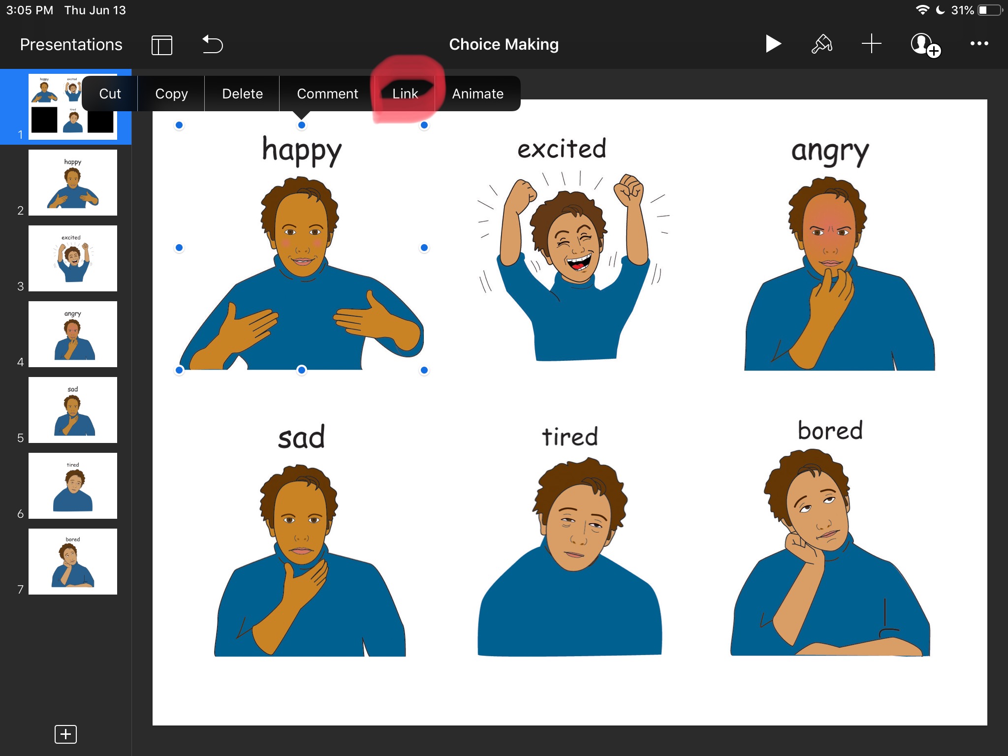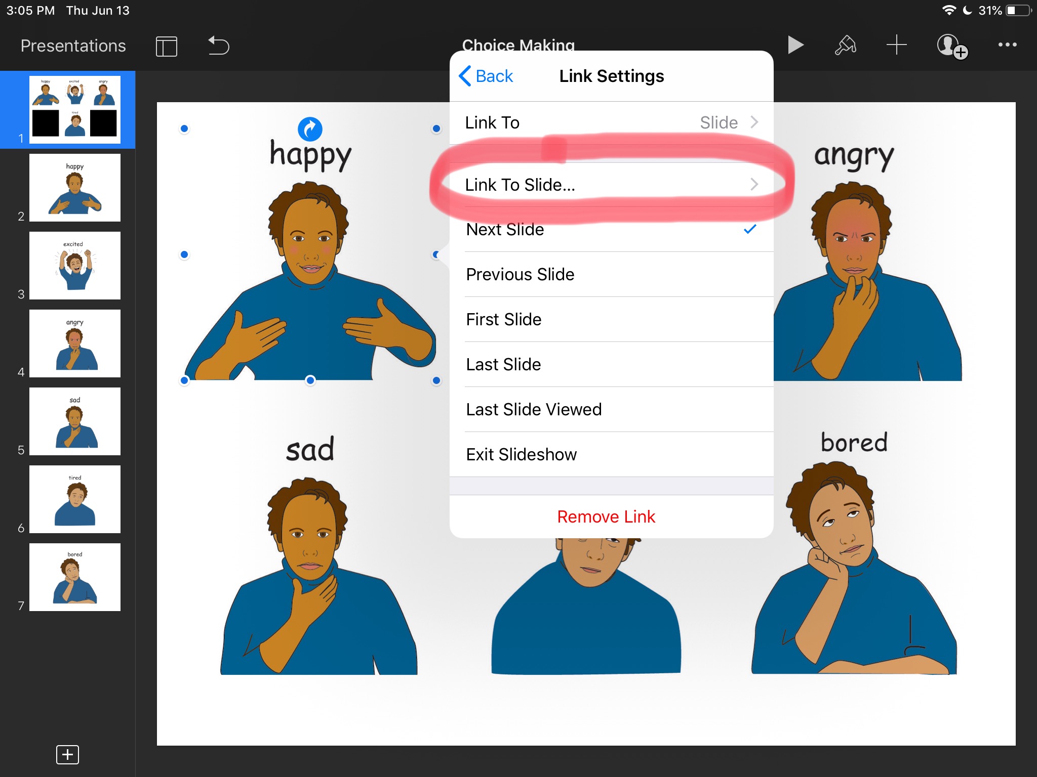 Let’s go back to the first slide and tap on a picture. Wait until options menu shows up, tap Link, then Link To Slide… and choose the correct slide number. Repeat the process for the other choices.