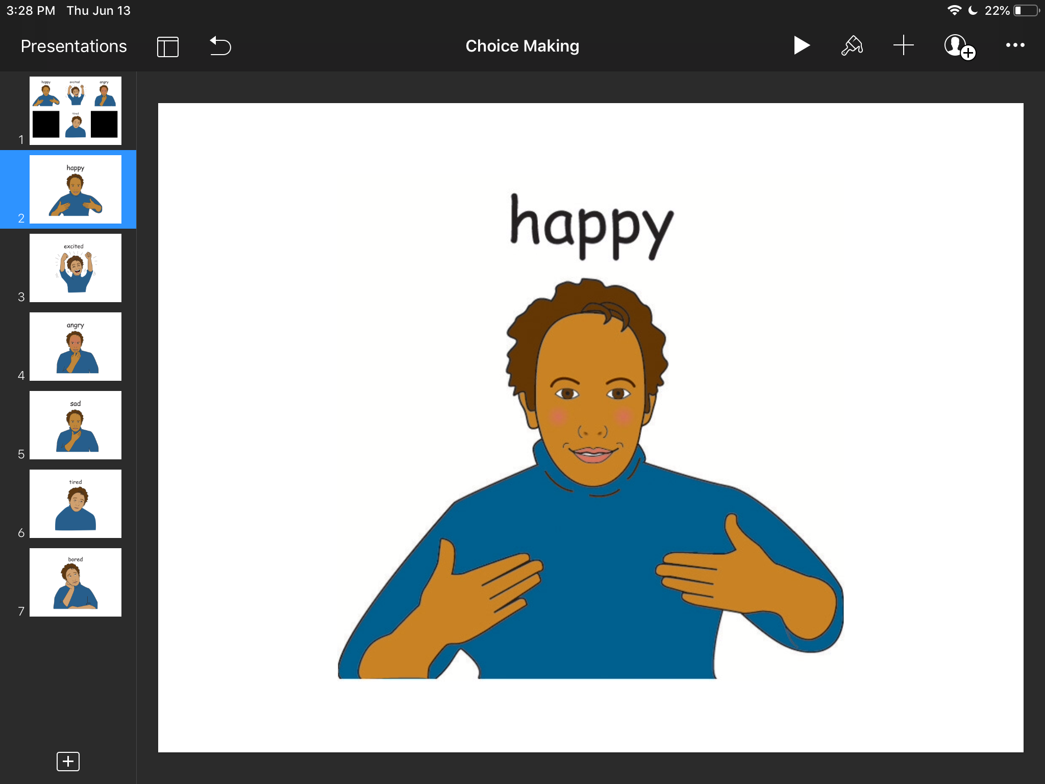 Now, to run this as an “app” just start the presentation by tapping Play button in the top right. Tap on any of the pictures to make a choice and once on a “landing” slide, tap anywhere to return to “home” slide.
