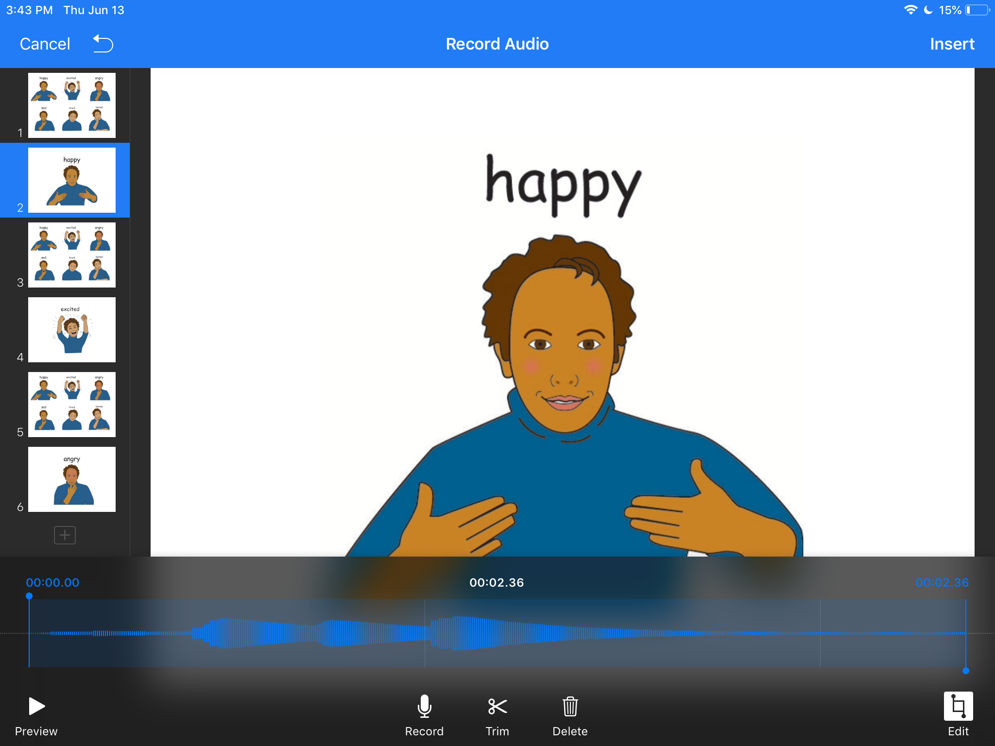 Go to a landing slide and tap the + (Add button) in the top right corner – choose Record Audio. Record audio and edit/trim it if needed. Once you’re satisfied Insert the audio.