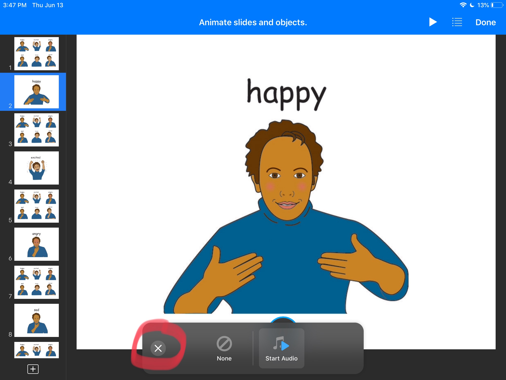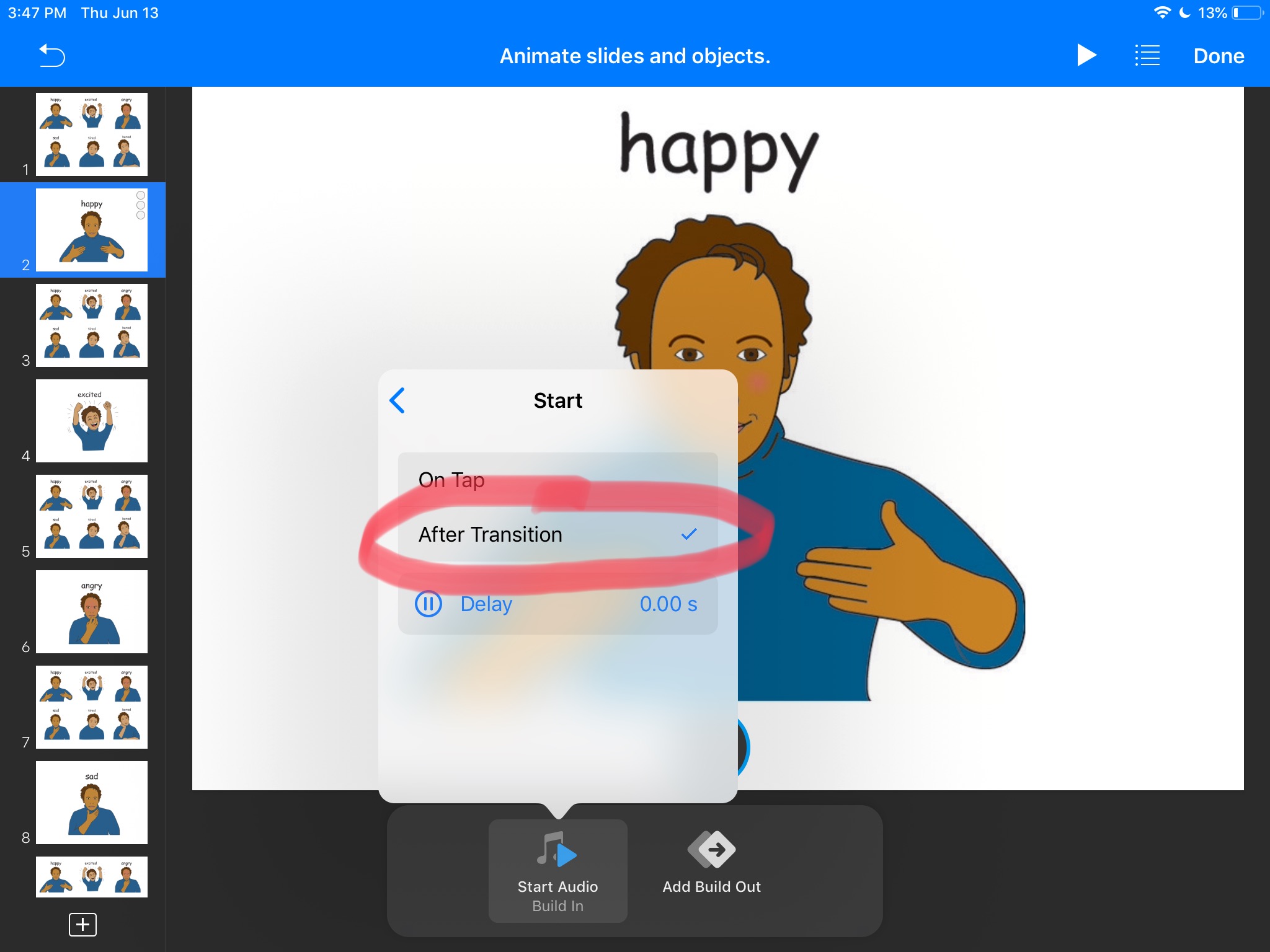 In order to make it play as the slide appears, we have to “animate” it. To do so, tap the audio icon and wait for the menu to pop-up. Once you see the menu, tap Animate. Tap Add Build In and choose Start Audio. Now tap the X sign to the left. Tap Start Audio and set Start to After Transition. Here you can also make the start of the audio delayed if you want to. Make sure to click Done in the top right to confirm the changes. Our landing slides will also give us audio feedback when they open.