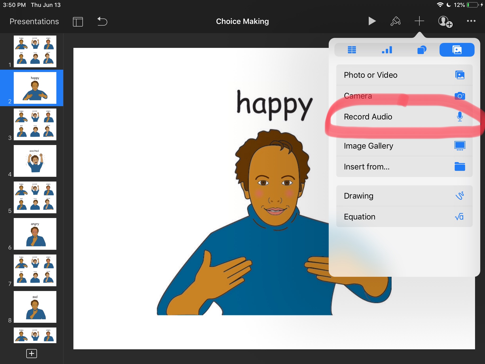 Offering different choices for clients can sometimes be tricky, especially if the choices are presented one by one and not at once. Often times, the client just goes for the first choice because it was presented first. You can easily create a choice board, using an iPad and Keynote app. The advantage of having the choice board on iPad is that you can easily make changes and you can even use camera to take a picture on the spot. Moreover, you can add audio feedback of client’s choice.