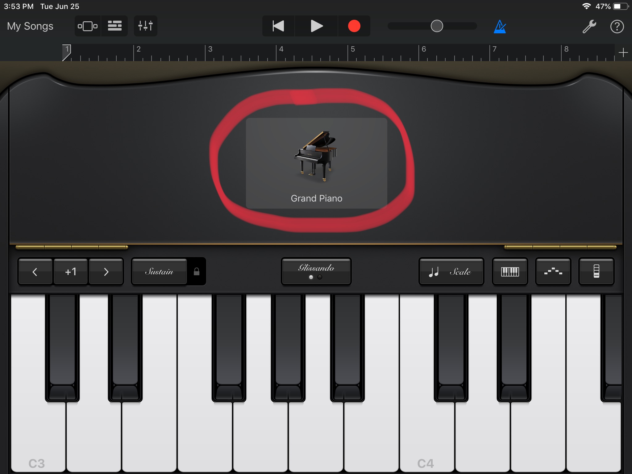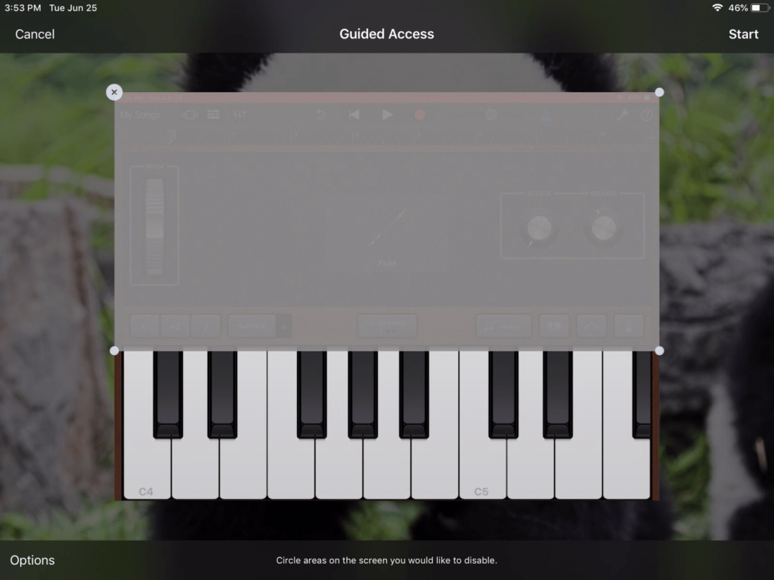 Open GarageBand and set up the virtual instrument. Once you set everything up press the Home Button three times. Mark the area you want to restrict and tap start in the top right corner. You can circle/mark as many areas as you want; it doesn’t have to be just a big block.
